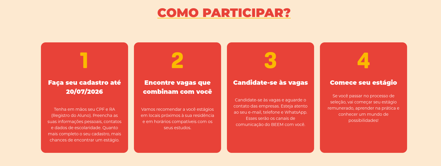 As inscrições para o BEEM estão abertas para empresas e estudantes! Os editais foram publicados no dia 23/02. Mobilizem os estudantes elegíveis para que se cadastrem no programa em https://www.beem.sp.gov.br/